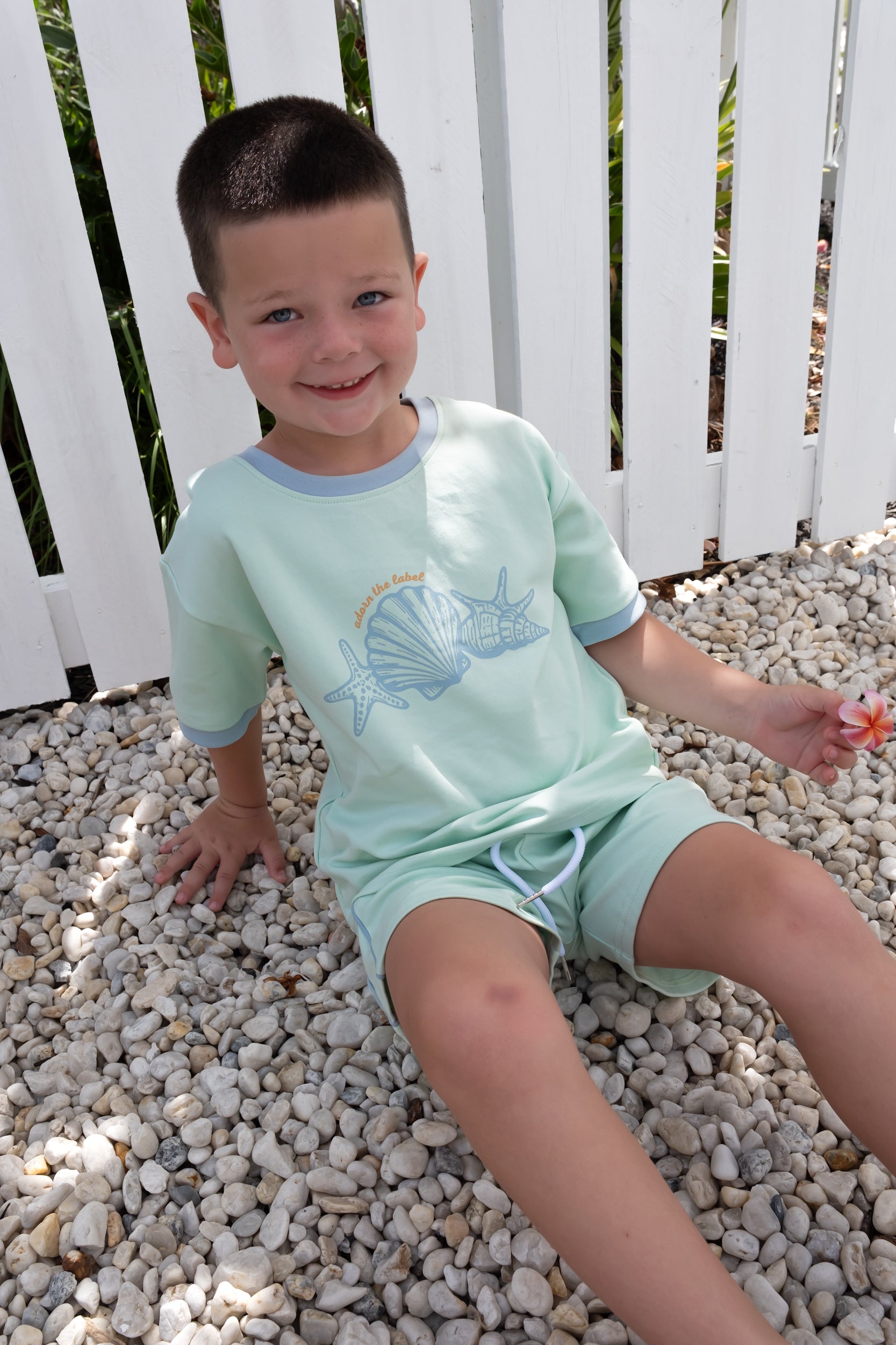 The front showcases our screen-printed shell illustration, bringing a coastal feel to your little one’s wardrobe.